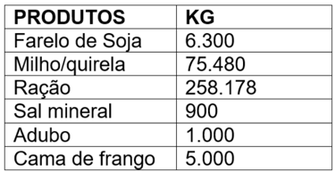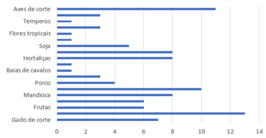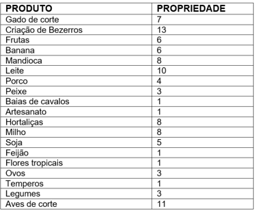 As propriedades têm uma grande variação na produção. Na tabela abaixo pode-se verificar os produtos produzidos e a quantidade de propriedades que elas produzem: