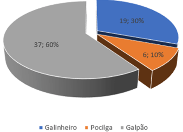 Quanto a estrutura das casas das propriedades, a maioria (56) são construídas em alvenaria, com banheiro interno e acabamento externo. Outras (17) são construídas de madeira e apenas 8 casas são de forma mista.