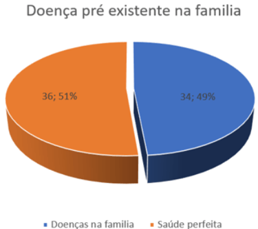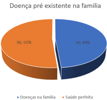 Questionado sobre problemas de saúde na família, 34 (49%) disseram ter problemas de saúde como pressão alta, colesterol, problemas cardíacos e diabete enquanto 36 (51%) disseram não ter problemas sérios de saúde.