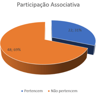 Foi perguntado nas entrevistas se os proprietários faziam parte de alguma associação ou sindicatos. Das respostas, obtivemos os seguintes dados: 22 (31%) pertencem a uma entidade associativa e 48 (69%) não pertencem. Dentre os que pertencem, a maioria são criadores de gado e estão filiados ao Sindicato Rural e alguns tem aviários e estão associados a Associação dos Aviários. Os que não pertencem a nenhuma entidade, demonstram já ter pertencido, mas, descontentes, se afastaram.